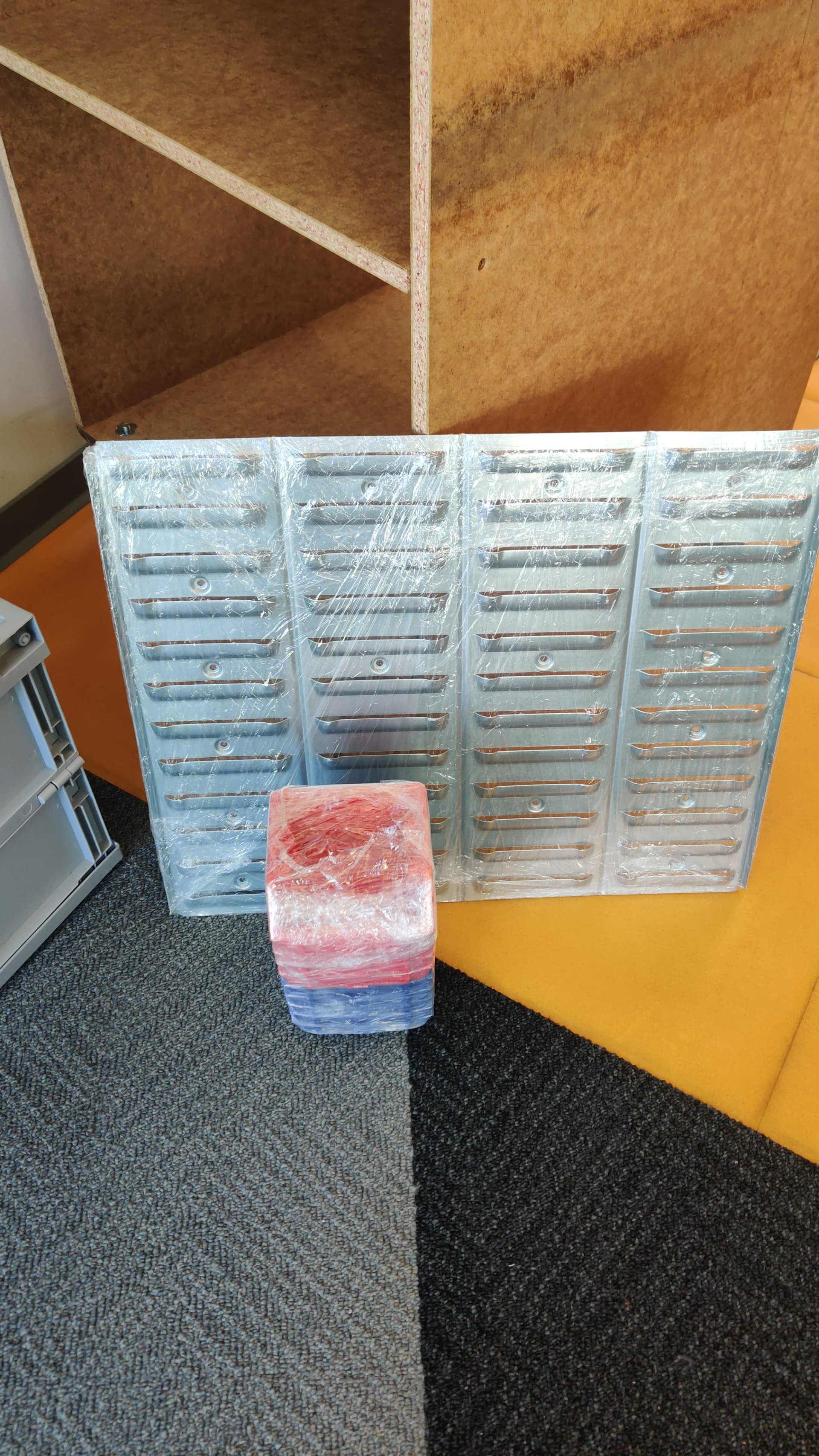 Die oberste gelaserte Skadis Platte wurde mit gedruckten Halterungen angeschraubt. Dabei ist aufgefallen, dass das original Skadis 5 mm dick ist und unsere Platte nur 3 mm dick ist. Daher werden gedruckte Teile nicht ohne Anpassung funktionieren.