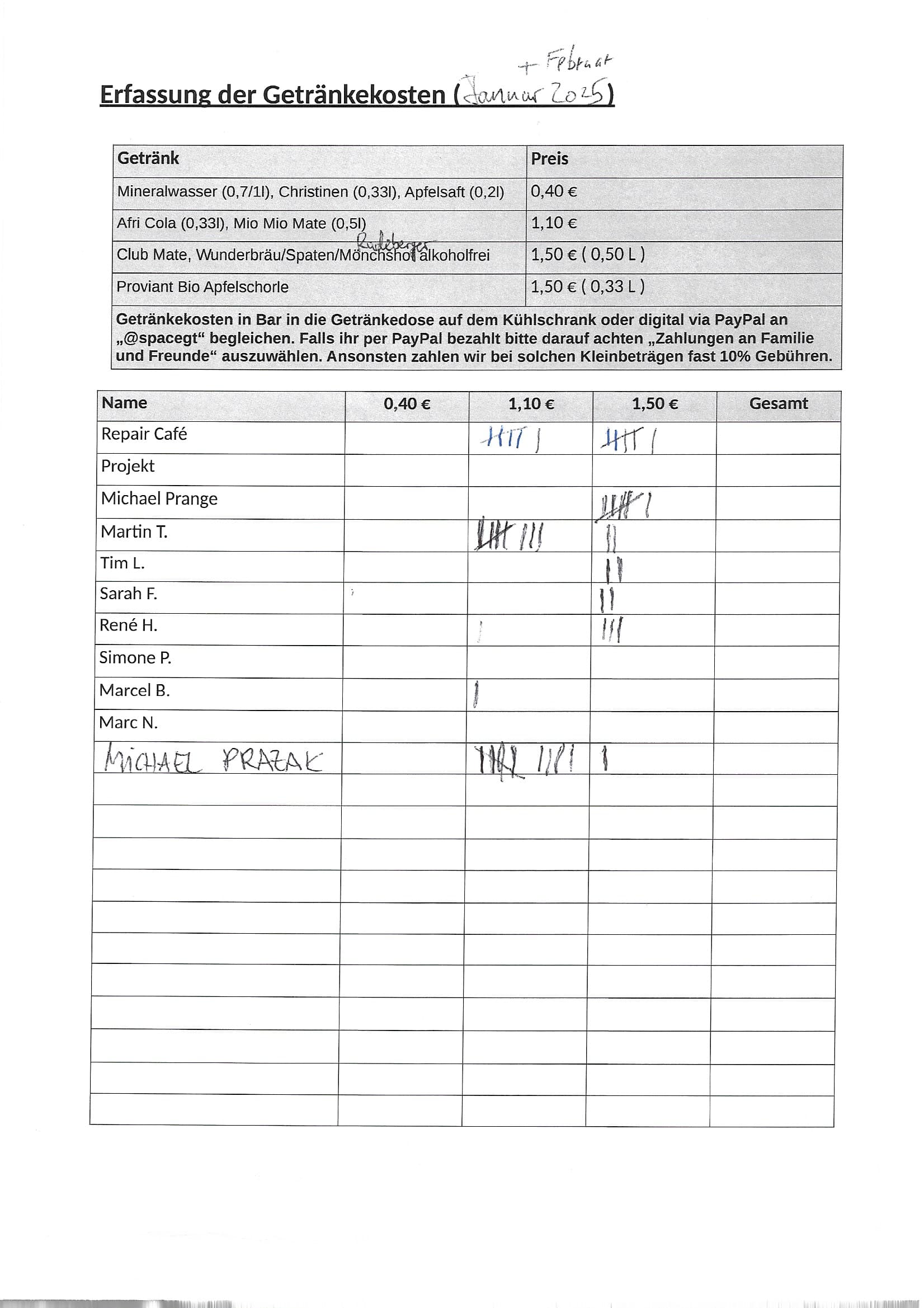 Begleichen kann man seine Ausstände in Bar in die Getränkedose auf dem Kühlschrank oder digital via PayPal an „@spacegt “. Falls ihr per PayPal bezahlt bitte darauf achten „Zahlungen an Familie und Freunde“ auszuwählen. Ansonsten zahlen wir bei solchen Kleinbeträgen fast 10% Gebühren.