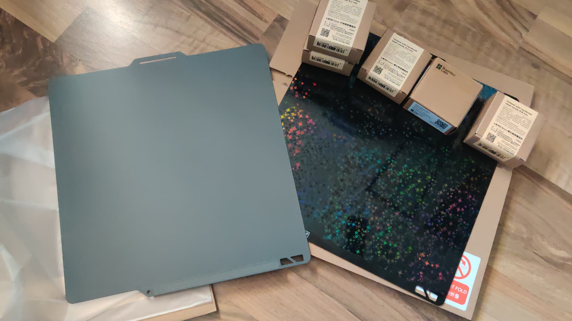 Für unseren neuen 3D-Drucker haben wir nun Düsen in allen größen 2x0,2mm, 2x0,4mm, 1x0,6mm und 1x0,8mm. Weiterhin eine sogenannte Cool-Plate gegen Warping und eine Effect Plate mit Starry Muster, das sich dann auf die Drucke Überträgt.