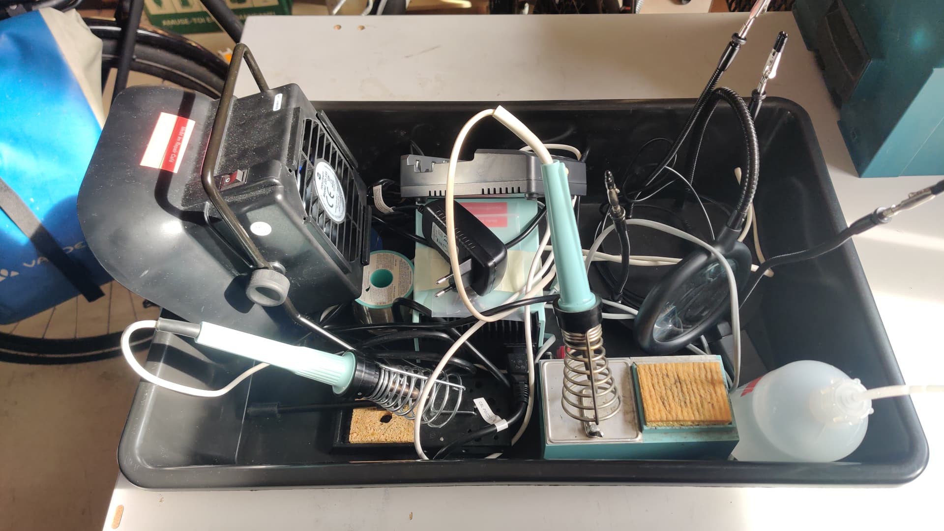 Wir müssen daran denken, die Lötkolben wieder mitzunehmen, die sind für die „Türen auf mit der Maus“ im Makerspace.