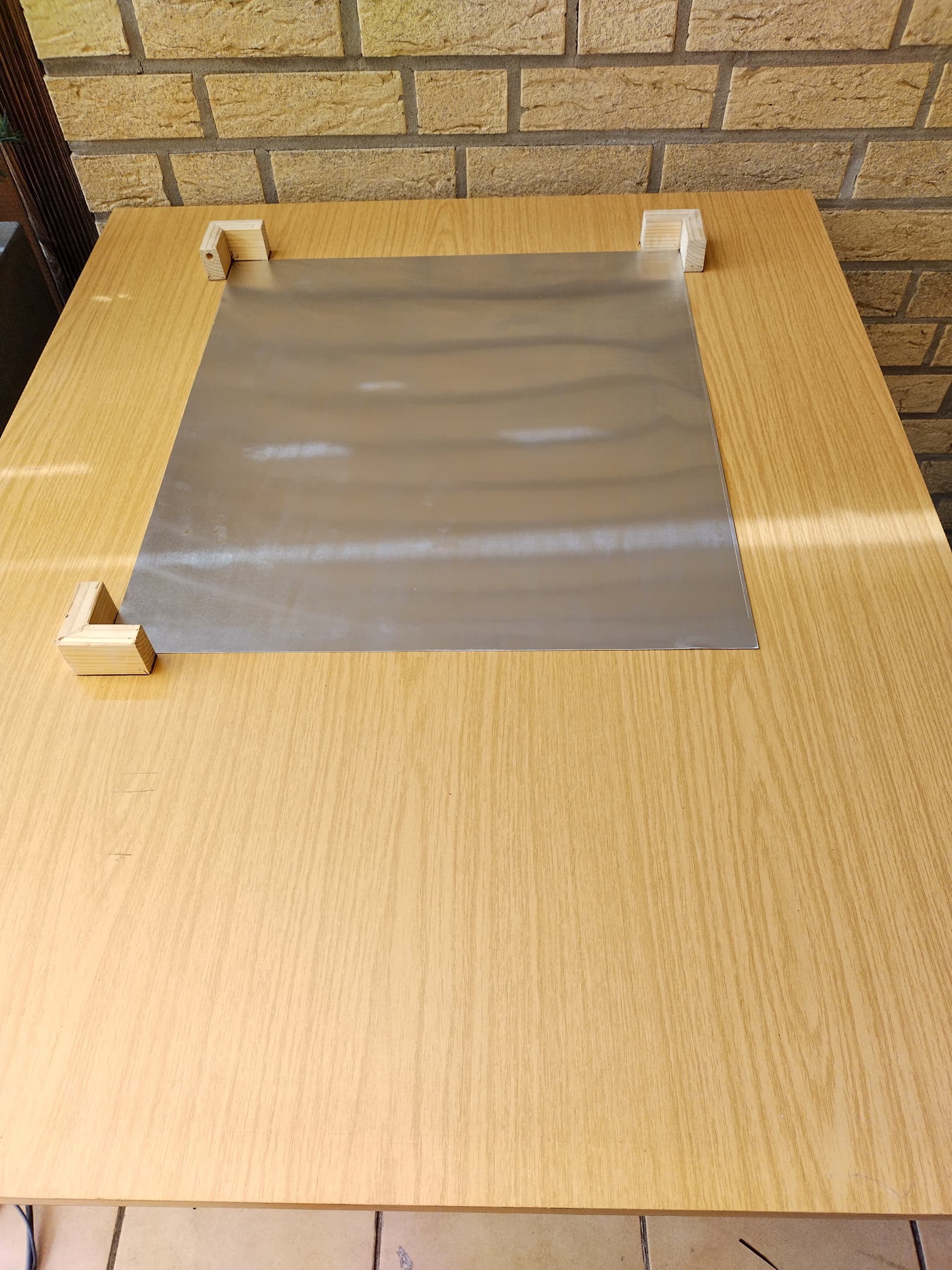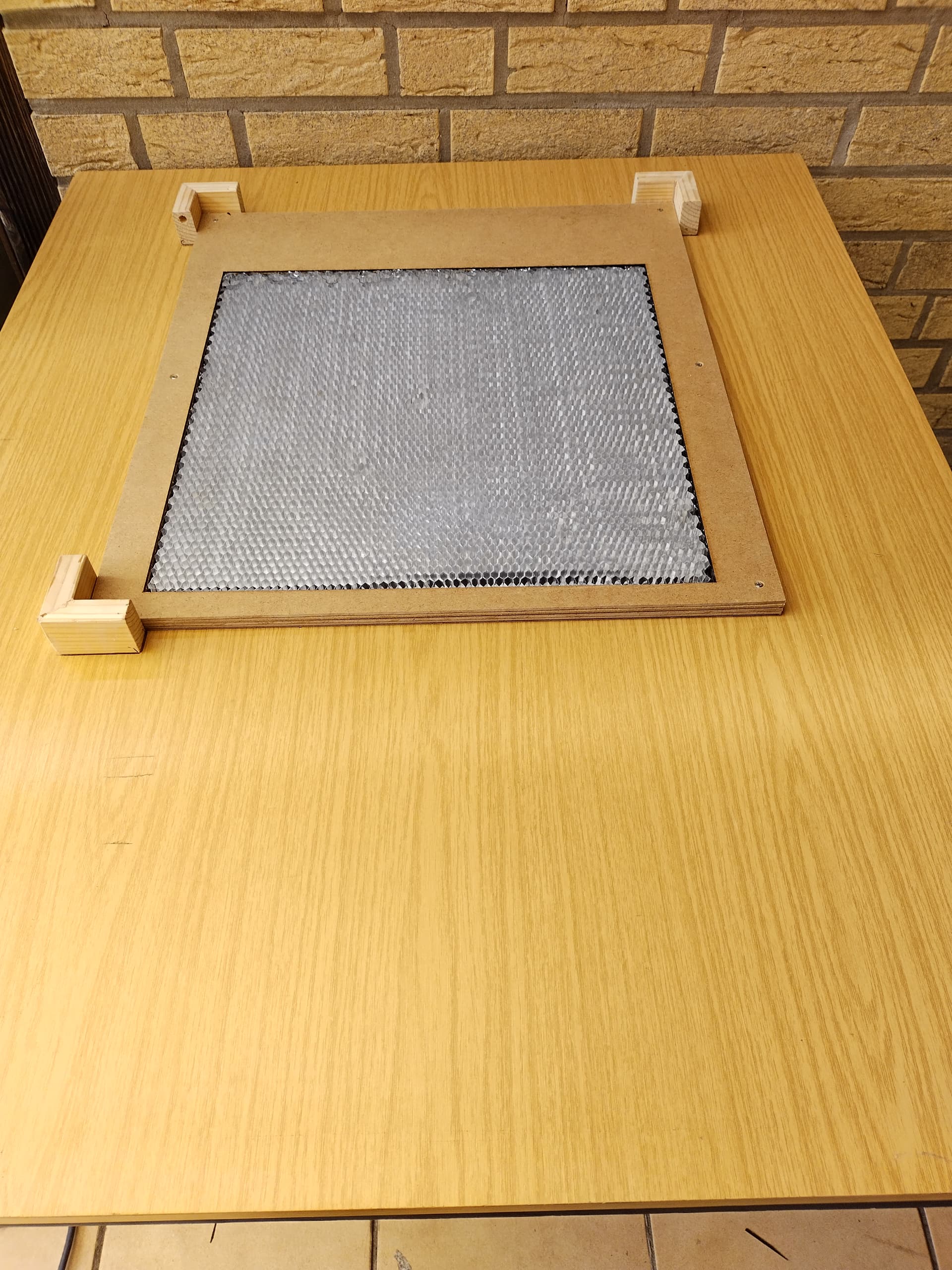 Zum Schutz der Holzplatte wurde eine Aluplatte besorgt. Diese liegt zwischen den Winkeln mit denen das Lasergestell fixiert wurde. Damit ich darauf eine 10 mm hohe Wabenplatte (40 x 40 cm) nutzen kann wurde ein fester Rahmen mit entsprechendem Ausschnitt in 12 mm Höhe gelasert. Hier mit dem Zusatzeffekt das man einen kleinen Anschlag für die zu verwendenden Materialien hat.